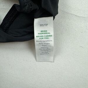 This Aerie American Eagle black bikini top is the perfect addition to any swimwear collection. It features a flattering crossover design with a keyhole halter neck, making it a trendy and stylish choice for pool or beach days. The top is made from a blend of high-quality materials including polyester, nylon, and elastane, ensuring durability and comfort. It's available in a size 2XS and is suitable for regular size types. The solid black color of this Aerie American Eagle bikini top makes it easy to pair with any patterned or colored swim bottoms. It's easy to care for as well, with a hand wash only recommendation to keep it looking its best. This top is a great choice for women who want to feel confident and comfortable while enjoying some time in the sun.