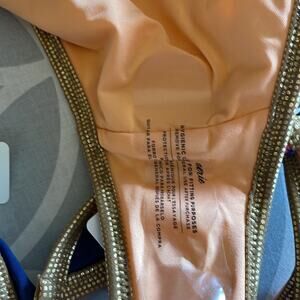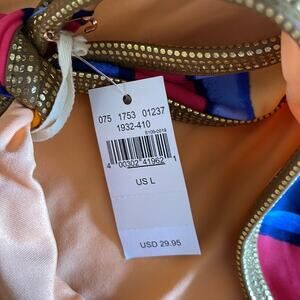 Adorable bikini push-up top with a center twist and a bottom that ties at the sides. Both have metallic gold trim. New with tags, sanitary shield still in place. Hand wash. Imported.