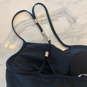 Aerie Black Strappy Bandea with Gold Hardware. Two front straps come up and over one shoulder and tie in down the back. Gold boho style hardware on the back strap. Pull over style. Padding included. Only worn once. In perfect condition.