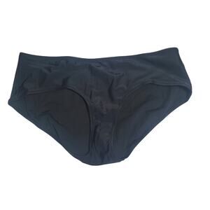 Bottoms: Solid black bikini bottoms, Women's Large, slight glossy sheen.