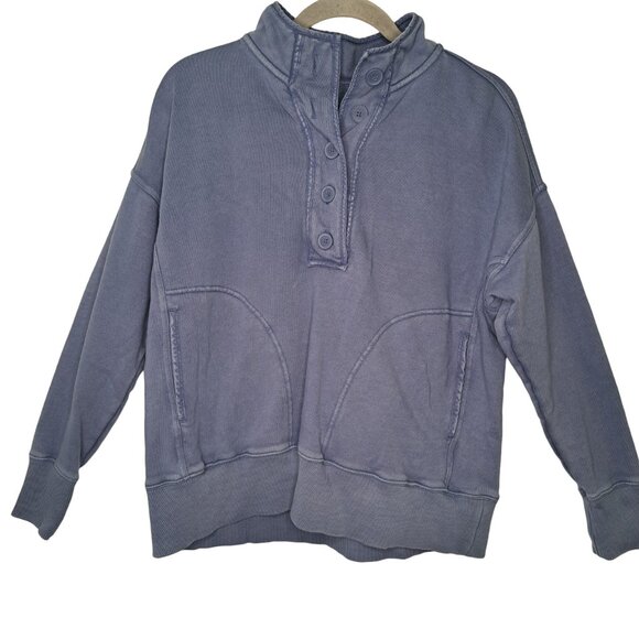 Grunge-style pullover from Aerie. Blue in color with buttons at the collar. A small whitish spot (last photo), otherwise very good condition. Stretchy. Size XS but is definitely oversized; measures about 22.5 inches between the pits, 23 inches long and 19 inch sleeves.