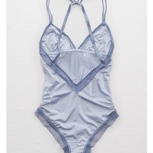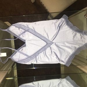 NEVER WORN ! NWT ✨ Baby blue bodysuit, crisscross adjustable straps, polkadot lace. So comfy and SO cute.. wear it as it is or under anything !