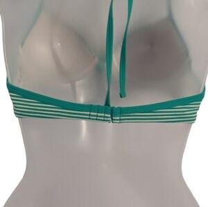 This bikini top is in gently used condition. It is a push-up style of cup. Pads are not removable. Can be tied tight or loose at the neck. Spot of discoloration on top part of underwire. Back has a hook closure. Please see photos for details.