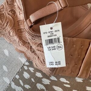 Experience the elegance of Aerie's brown lace bra, featuring a seamless construction and intricate floral lace overlay. The molded cups provide a comfortable fit, while the swirling botanical motifs add a touch of sophistication. Perfect for wearing under light-colored outfits, this bra combines style and versatility.