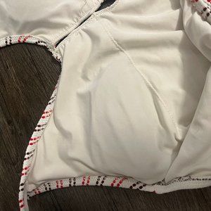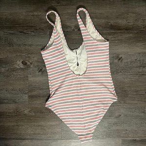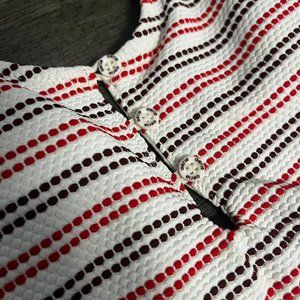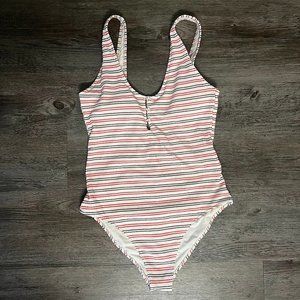 Chic one piece with button accents. Cream, red, and brown striped pattern. I’m 5’9” with an average length torso and the straps are a bit too long on me (not adjustable). Super cute if you are a bit taller or have a longer torso!