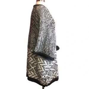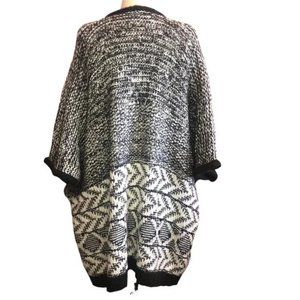 Chunky Knit Poncho/ Cape with Charcoal/ Ivory White design and Fun pom-pom detail.