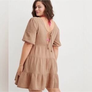 Easy, breezy, and effortlessly flattering, this Aerie “Pool to Party” dress is the perfect throw-on-and-go piece for summer. Made from soft 100% cotton gauze in a warm cappuccino brown, it features a tiered silhouette, puff sleeves, and a deep V neckline with a flirty low scoop back and adjustable tie detail. Whether layered over a swimsuit or worn on its own, this dress brings relaxed boho charm to beach days, brunch, and everything in between.