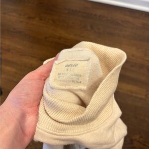 This Aerie top is a cozy oversized hoodie in a soft cream color, featuring a relaxed fit and stylish blue text across the chest. Designed with long sleeves and ribbed cuffs, it offers a comfortable and casual look perfect for everyday wear