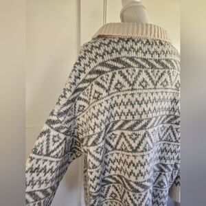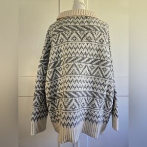 Stay warm and stylish with this cozy cream and gray patterned sweater. Perfect for any casual outing.