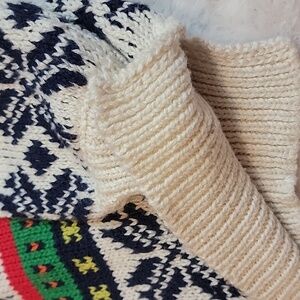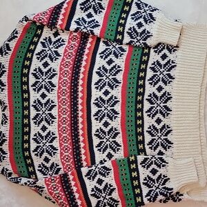 Warm knit sweater with a festive pattern. Features cream, navy, green, and red colors.