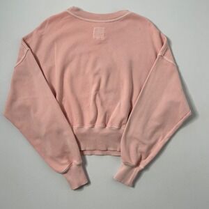 A cozy essential gets a stylish update in this Aerie cropped pullover sweatshirt. Embrace the effortless charm of this soft pink sweatshirt, designed to provide both comfort and contemporary style. The classic crew neck and long sleeves offer a timeless silhouette, while the ribbed cuffs and hem add a touch of texture and ensure a snug fit. Its cropped length adds a modern twist, making it perfect for pairing with high-waisted jeans or leggings. There is a small spot on the left shoulder. Ideal for relaxed weekends, casual outings, or cozy nights in.