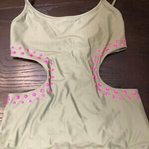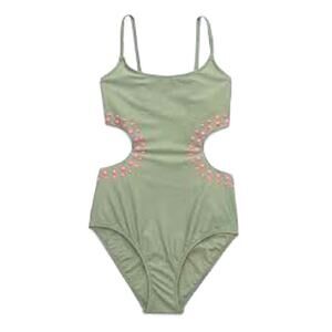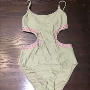 Aerie Cut Out Full Coverage One Piece Swim suit olive green with pink dots sz s