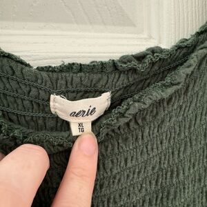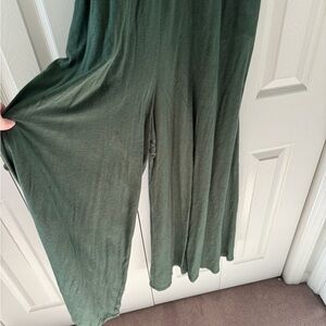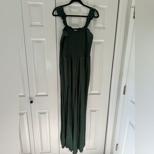 Stylish dark green jumpsuit. Features ruffled straps and a flowing design. Perfect for casual outings.