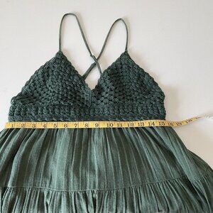 Chic mini dress with crochet top. Flowy tiered skirt. Perfect for casual outings.