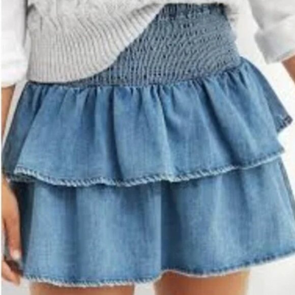 Aerie Denim Mini Skirt Ruffle Tiered Smocked Waist Blue Size Medium