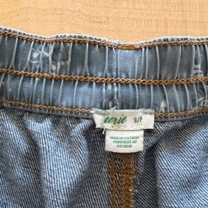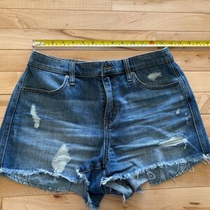 These stylish distressed denim shorts feature a frayed hem and multiple distressed details for a trendy, casual look. They include classic five-pocket styling and a button/zipper closure. Bandana fabric peeks out underneath the frayed areas for a unique touch. Lightly worn and in great condition.