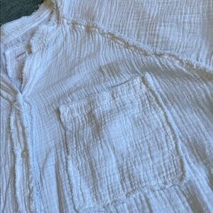 Textured white waffle knit shirt with button-up design. Features a front pocket, raw hems. Soft and comfortable. Good color for fall layering, great pre loved condition size XL