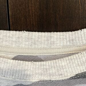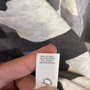 This sweatshirt is made by Aerie. It’s a multi tone gray camo print with light factory distressing on the collar and cuffs. Size large and in very nice pre owned condition. Smoke and pet free home.