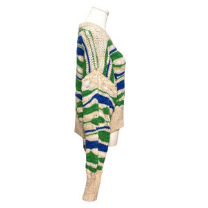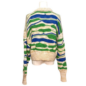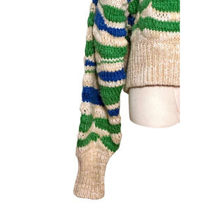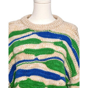 Aerie Green Blue Wavy Striped Crew Neck Chunky Knit Balloon Sleeve Sweater Small