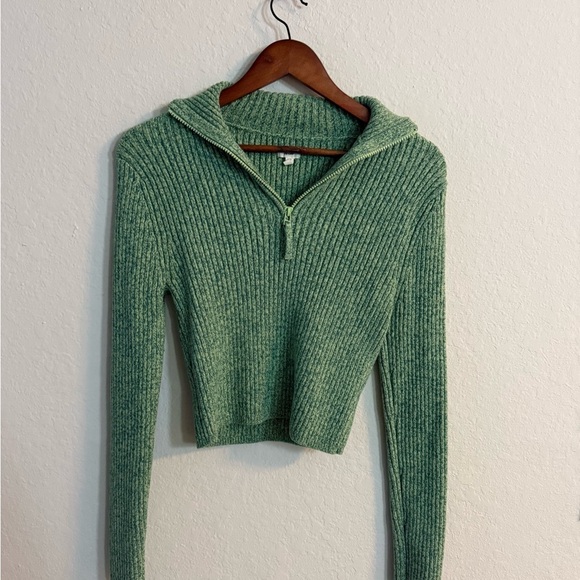 Stylish green ribbed sweater with a zip-up collar. Perfect for layering.
