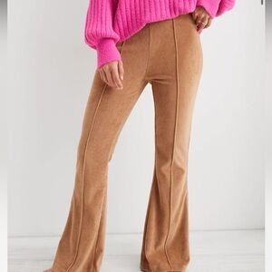 Embrace a blend of vintage and modern style with Aerie's dark tan groove-on rib velour flare pants. These pants feature a high-waisted design and a dramatic flare from the knee, offering a retro-inspired silhouette. Made from a soft, stretchy material, they ensure comfort and versatility for casual wear. Size Small. Like new!