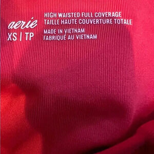 This is a brand new red bikini bottom from Aerie. It has full coverage and is high-waisted. The size is XS and it is made in Vietnam. It is made of stretchy material and should be hand washed only.