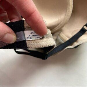 * Features: black lace, small bows at straps, underwire, tan lining, adjustable straps, double hook-and-eye closures in back