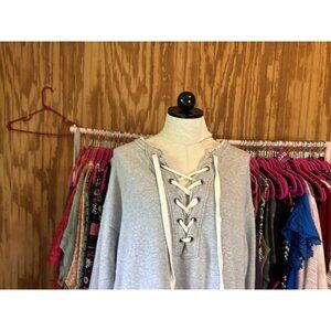 Aerie Lace Up Oversized Crew Sweatshirt Grey Long Sleeve Distressed Sz L