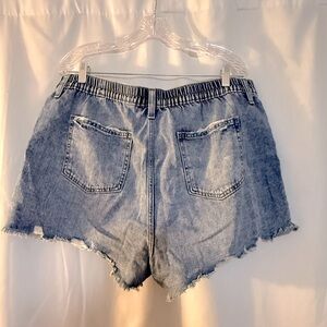 Trendy distressed jean shorts. Light blue wash. Perfect for casual wear.