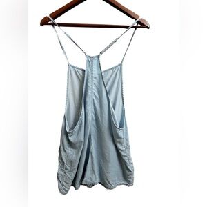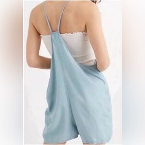 Stylish light blue jumpsuit. Features adjustable straps. Comfortable and chic.
