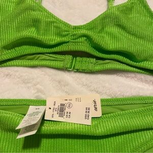 Bright lime green bikini with ribbed texture. Ideal for sunny beach outings.