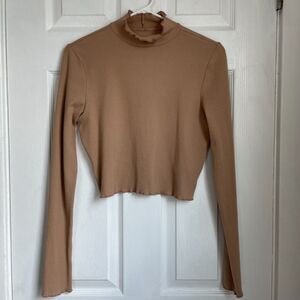 Aerie Long Sleeve Cropped Mock Neck Long sleeve T-Shirt scalloped hem size L tan