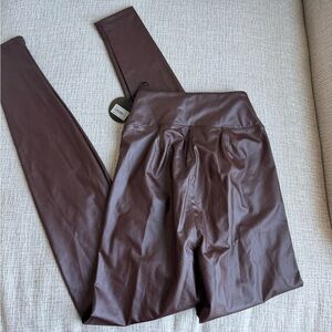 Chic chocolate faux leather leggings. Ideal for a trendy outfit.