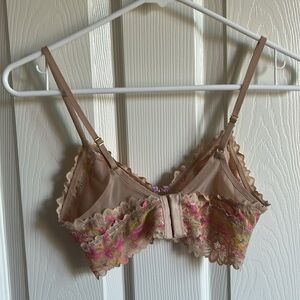 Vibrant lace bra with adjustable straps. Features pink, yellow, and tan hues. Comfortable and stylish.