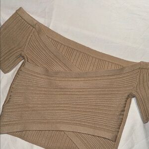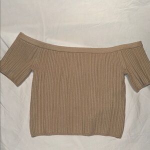 Never worn. Elevate your style with this chic off-shoulder ribbed sweater. Perfect for any occasion, this tan sweater offers both comfort and elegance.