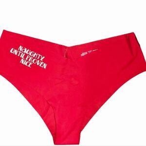 Vibrant red cheeky panties featuring a playful 'Naughty Until Proven Nice' print.
