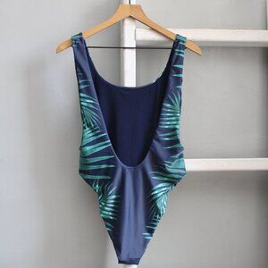 Aerie Navy Blue Green Palm Leaf Print Super Scoop Cheekiest One-Piece SZ Large