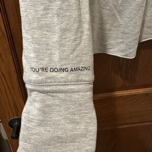Wrap yourself in the cozy embrace of this Aerie OFFLINE turtleneck sweatshirt. Crafted for ultimate comfort, this heather grey top features a stylish cowl neck and a subtle yet empowering "You're Doing Amazing" embroidered detail on the sleeve, serving as a gentle reminder of your strength. The thumbholes add a touch of athleisure chic, perfect for layering or wearing on its own. Ideal for relaxed weekend mornings, post-workout recovery, or casual outings.