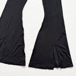 sleek and flattering black flare leggings from aerie’s offline real me extra line. designed with a smoothing hi-rise waistband and dramatic flared legs finished with trendy split hems. perfect for yoga, lounging, or pairing with casual streetwear looks. stretchy, comfortable fit with a lightweight feel.