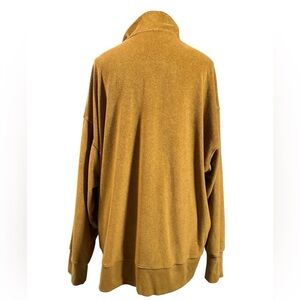 Soft and comfortable golden terry cloth sweatshirt. Features a stylish quarter-zip design. Ideal for casual wear. Has front pockets.