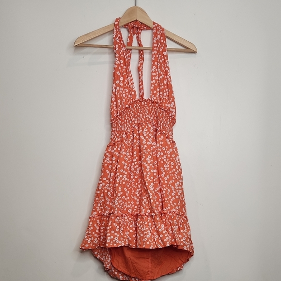 Vibrant orange halter top with white floral design. Ideal for casual wear.
