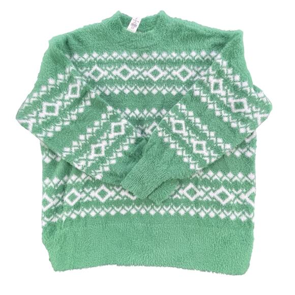 Chunky, cozy Fair Isle sweater in a vibrant Kelly green with a soft, plush feel. Designed as an intentional oversized fit with dropped shoulders and a relaxed, slouchy silhouette. Easy throw-on layer for winter through early spring and especially great for St. Patrick’s Day styling.