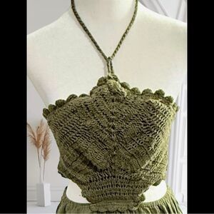 Aerie Pool To Party Boho Olive Green Crochet Halter Mini Cottagecore Dress Sz M
