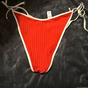 Vibrant red bikini bottom with white edging. Perfect for beach days.