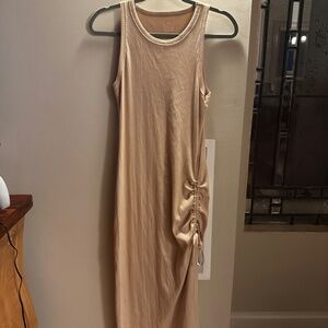 Beige bodycon dress with slit on side and with cinched detailing. Super soft and comfy!
