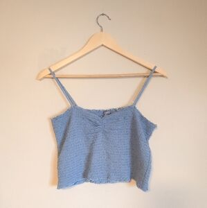 Entirely smocked on the front and back to fit any body type. The small amount of rouching on the front is so flattering along with the soft blue color. In perfect condition. No stains or flaws.