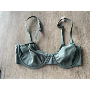 This army green bra is comfortable and a perfect basic. It is a mesh unlined material that is a balconette style. It has an underwire for extra support. The green color is a classic shade and not too bold. It has adjustable straps and a classic hook and eye closure. It has a comfortable stretch so if shapes to your body. New, it is missing the paper tag but still has the other tags.