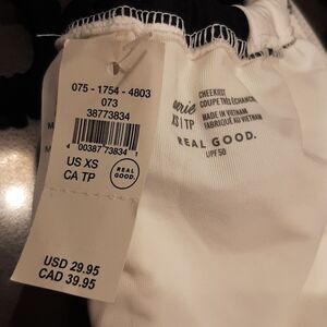 Stylish bikini bottoms in black and white stripes and bright yellow. Perfect for a beach day.