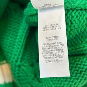 Chunky cable-knit V-neck sweater in vibrant green with cream varsity stripes. 100% cotton with a breathable, substantial feel. Slightly cropped with a relaxed fit.