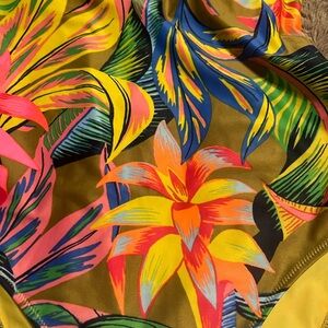 Bright floral one piece with tropical vibes. Features pink, yellow, and green patterns. Perfect for beach days. Only worn once.